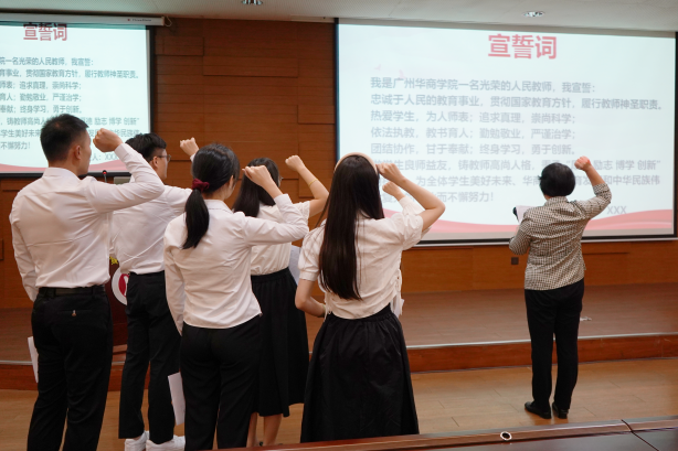 会上,全体新教职工在支戈壁副校长的带领下,进行庄严的入职宣誓仪式。坚定有力的誓词回荡在报告厅内, 新教职工必将秉承“厚德、励志、博学、创新”的校训,做学生良师益友,铸教师高尚人格,为全体学生美好未来、华商学院教育发展而不懈努力。随后,全体新教职工签署了师德承诺书。