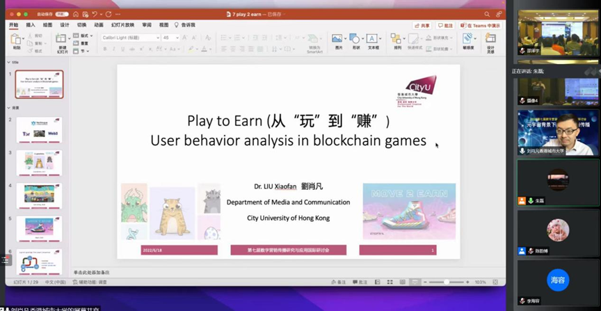 在热烈的讨论之下,香港城市大学助理教授刘肖凡博士分享了区块链游戏中的用户使用行为分析。指出元宇宙和区块链一样,可以带来新的社交、娱乐、营销场景,认为无论是区块链世界还是VR世界,首先要搞清楚用户来到这里的目的,以及思考元宇宙经济发展的动力来源是什么的问题。