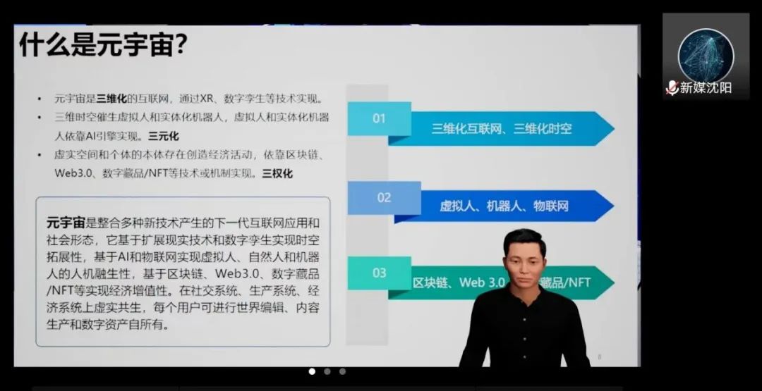 论坛中,清华大学新闻学院博士生导师沈阳教授带来了虚拟形象的新奇呈现形式,联动线上线下。借助于虚拟分身,沈阳教授着重探讨了元宇宙的发展与挑战并提出了标准元宇宙的构建步骤,包括数字孪生、虚拟原生、虚拟共生、虚实联动等。个体将通过在元宇宙中的实践促进虚拟环境与现实环境的良性互动,最终实现人的发展和社会发展在虚拟和现实两个层次上的和谐。