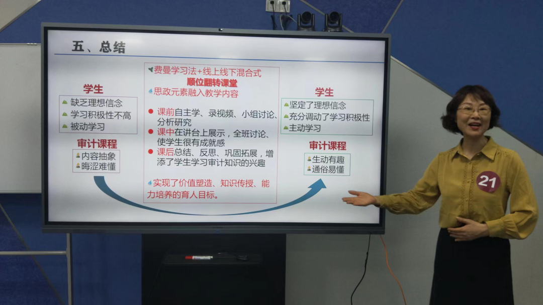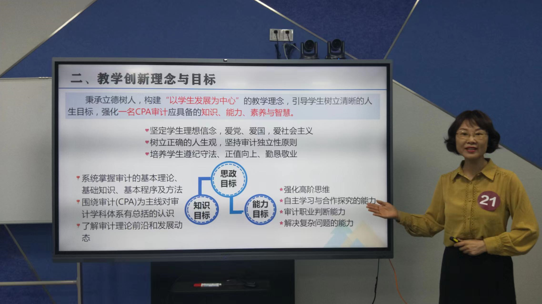 本次比赛中,夏老师在创新教学内容方面,打破课程原有章节,从知识点的熟悉理解层面建立起学生知识接口,引发学生学习兴趣,在教学重点讲解环节建构学生课程知识体系,培养学生思维能力,在教学难点阐述环节与学生分享审计CPA人的情怀与智慧,达到立德树人,德、智、法教育同向,打造高阶课堂。