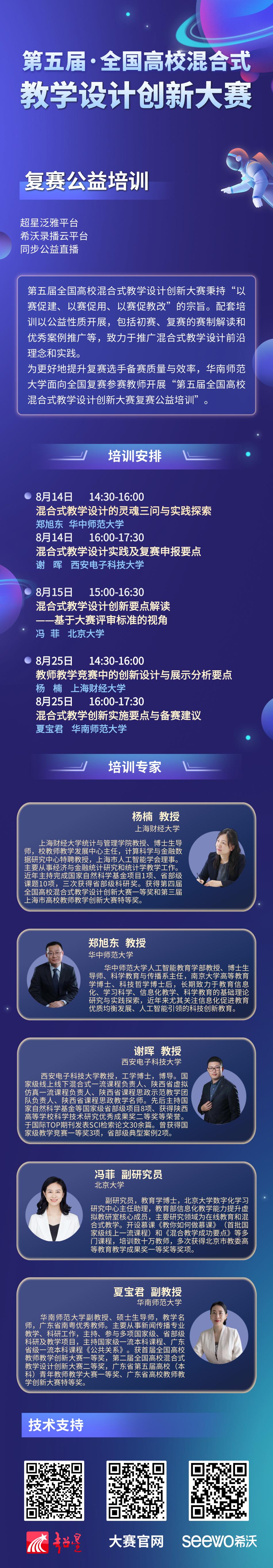 第五届全国高校混合式教学设计创新大赛秉持“以赛促建、以赛促用、以赛促教改”的宗旨。配套培训以公益性质开展,包括复赛的赛制解读和优秀案例推广等,致力于推广混合式教学设计前沿理念和实践,更好地提升复赛选手备赛质量与效率,帮助参赛选手熟悉复赛策略与注意事项。